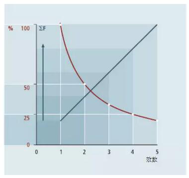 總溫差是第一效的最大允許加熱溫度和最后一效的最低沸點之差,這個溫差在其中各效間分配,所以每效的溫差隨著效數增加而減少。由此,為了達到要求的蒸發量,各效的加熱表面積必須相應擴大,但溫差較低。下圖表明隨著蒸發裝置的效數增加,全部各效的總加熱表面積也呈線性比例增加。因此,投資費用大幅上漲,而節省的能量卻越來越少。